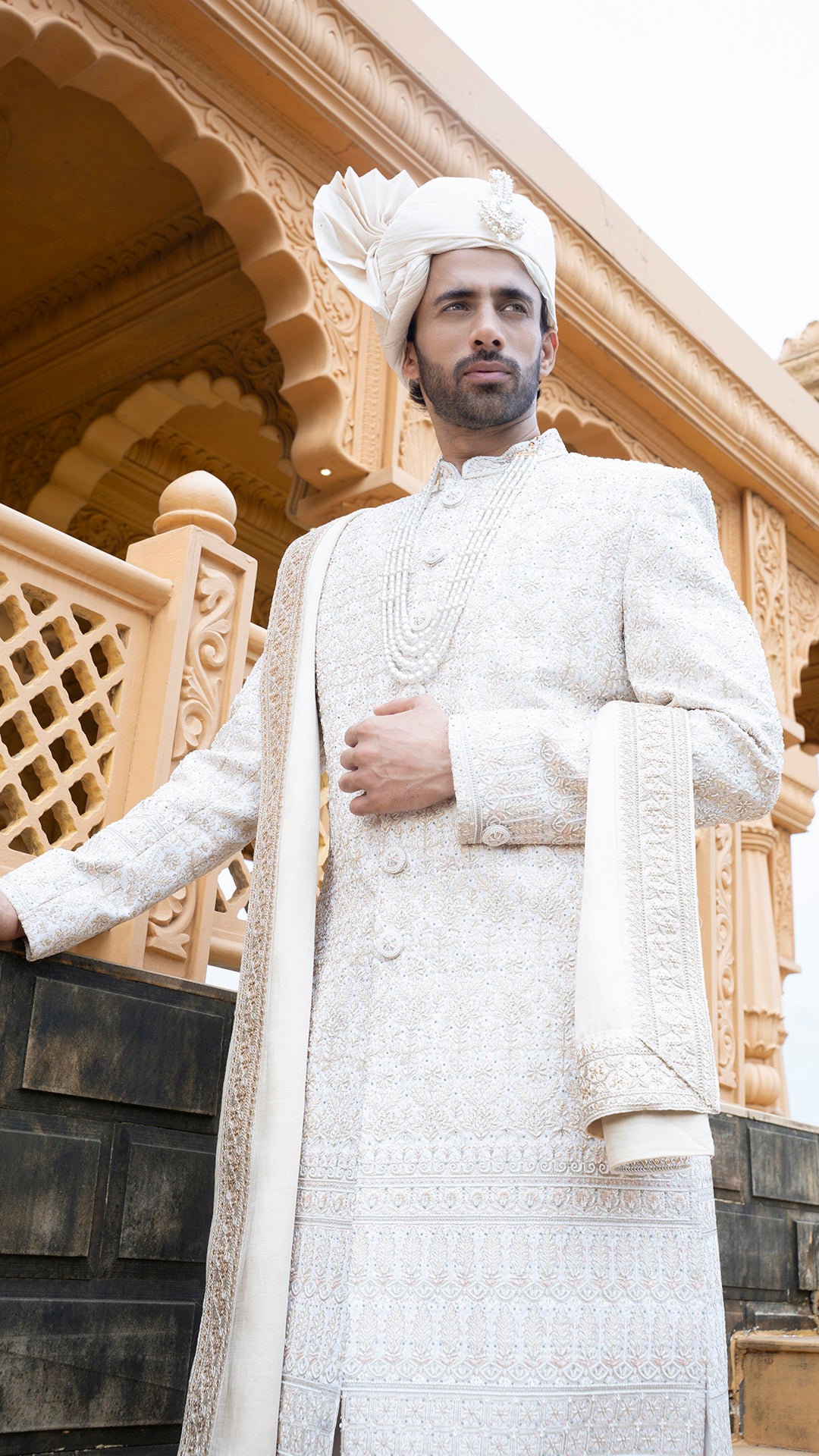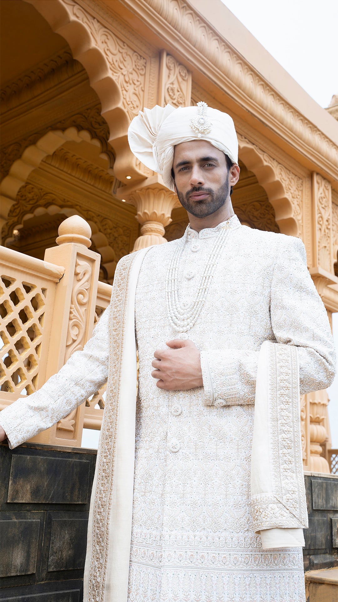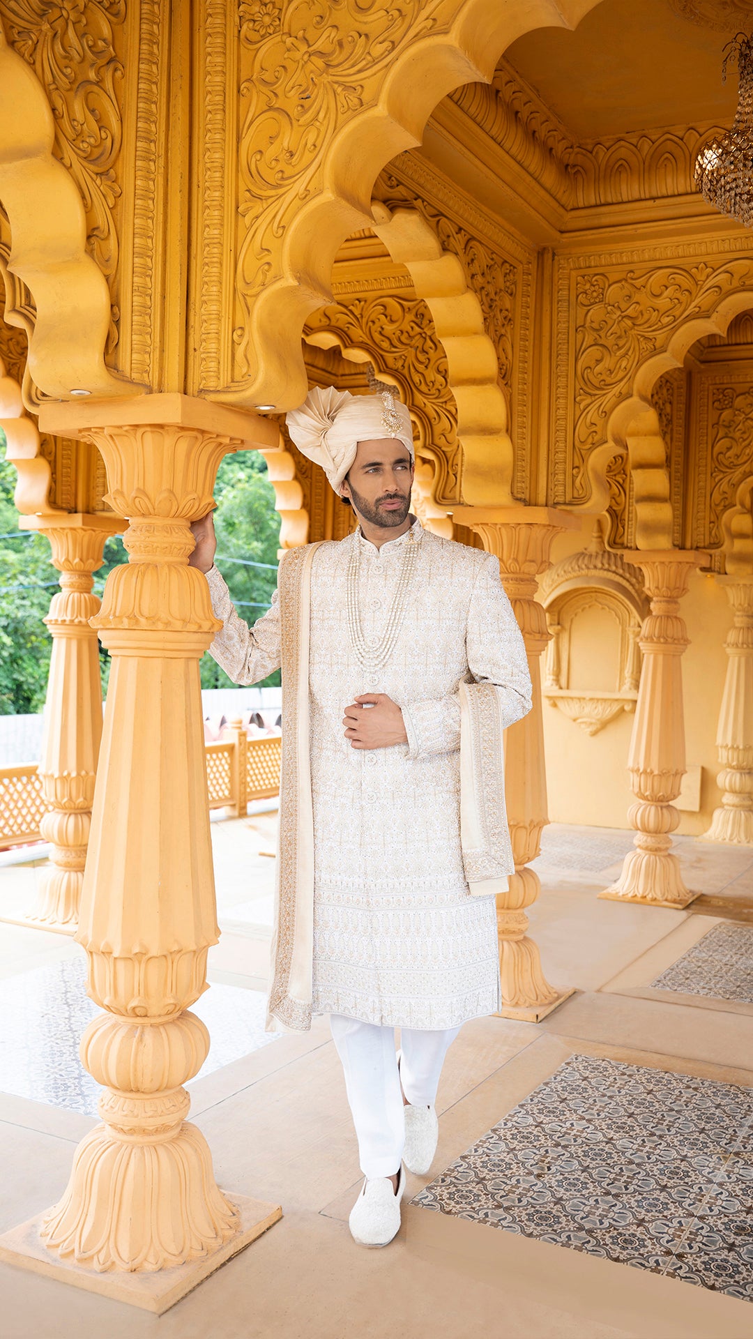 Crafted for the modern maharaja, the Golden Groom Sherwani is a complete ensemble featuring ornate embroidery, a statement stole, safa, and kilangi. It’s luxury layered in culture fit for the wedding aisle and beyond.