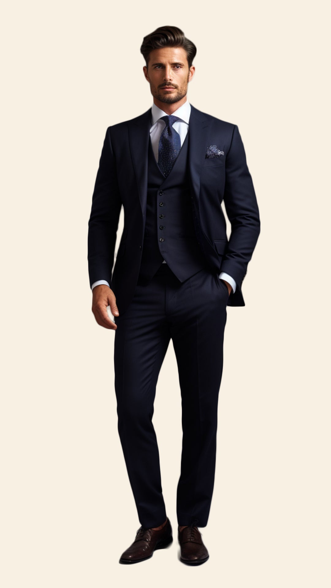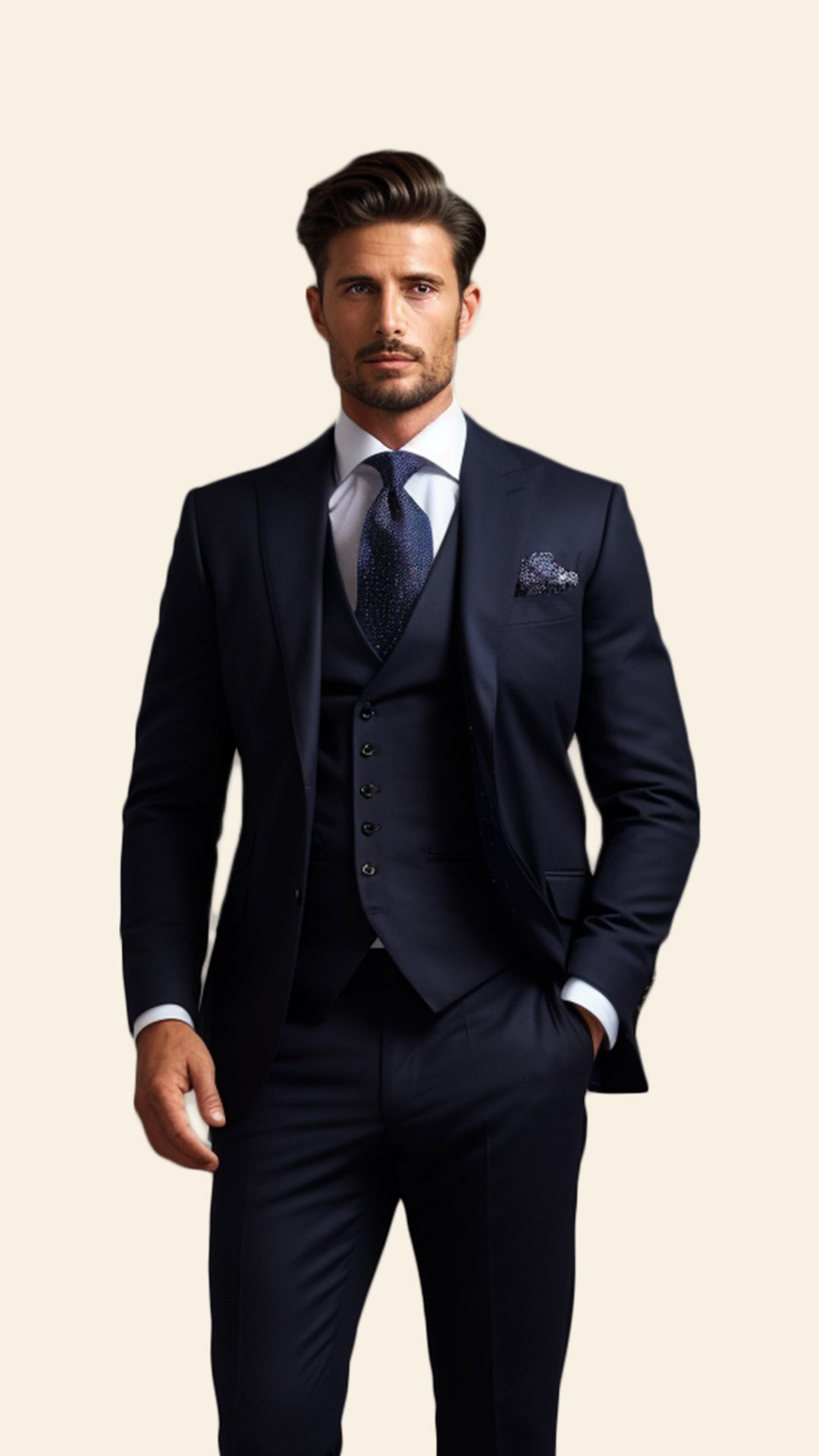 Custom Men's Three-Piece Blue Suit in Navy Shade - Crafted in Terry Rayon by BWO