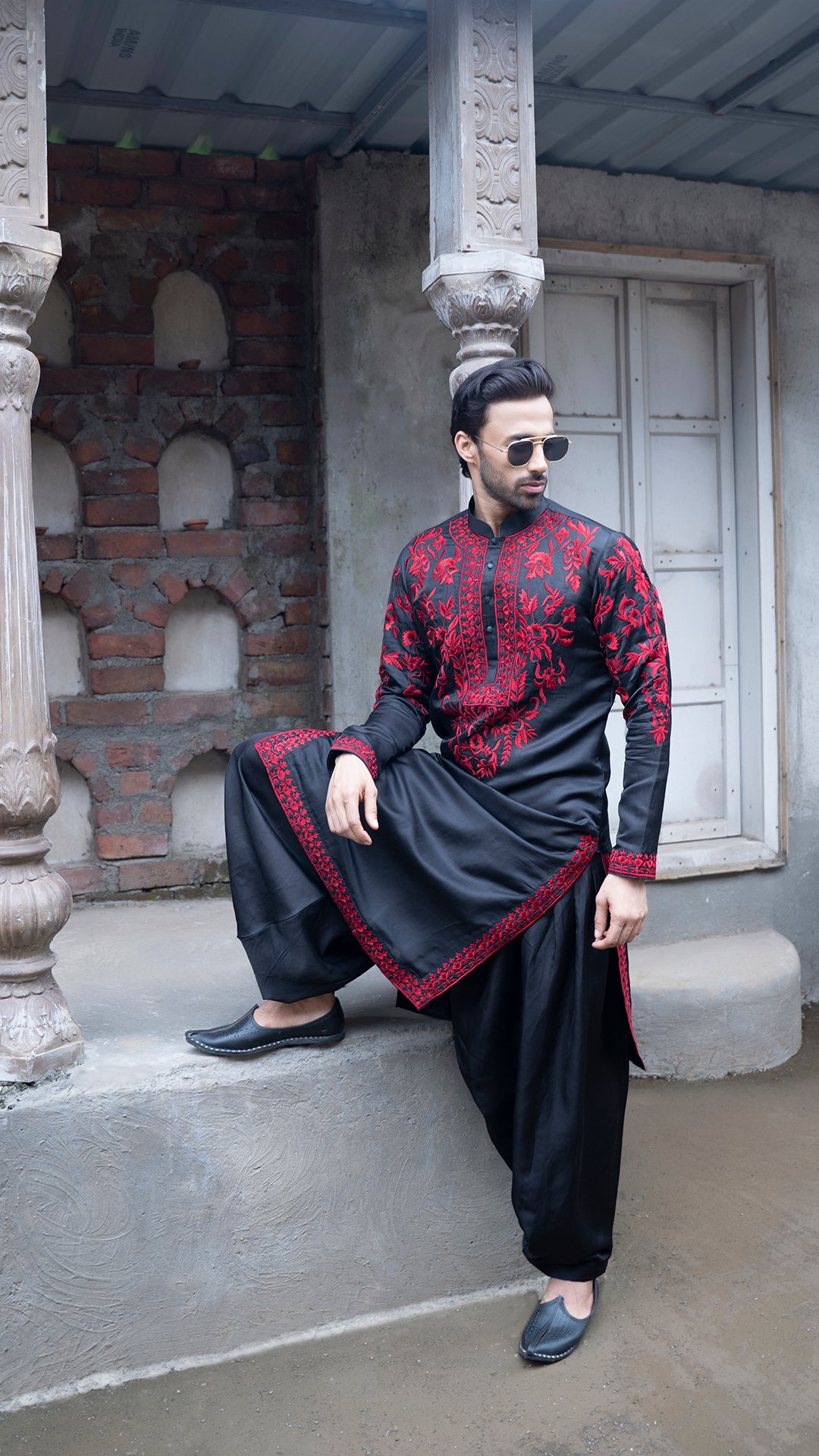 Dramatic and striking, this black men’s kurta with red embroidery offers a royal yet contemporary vibe. Crafted from premium linen satin and adorned with rich red threadwork, it’s the ultimate outfit for weddings, receptions, and grand festivities.
