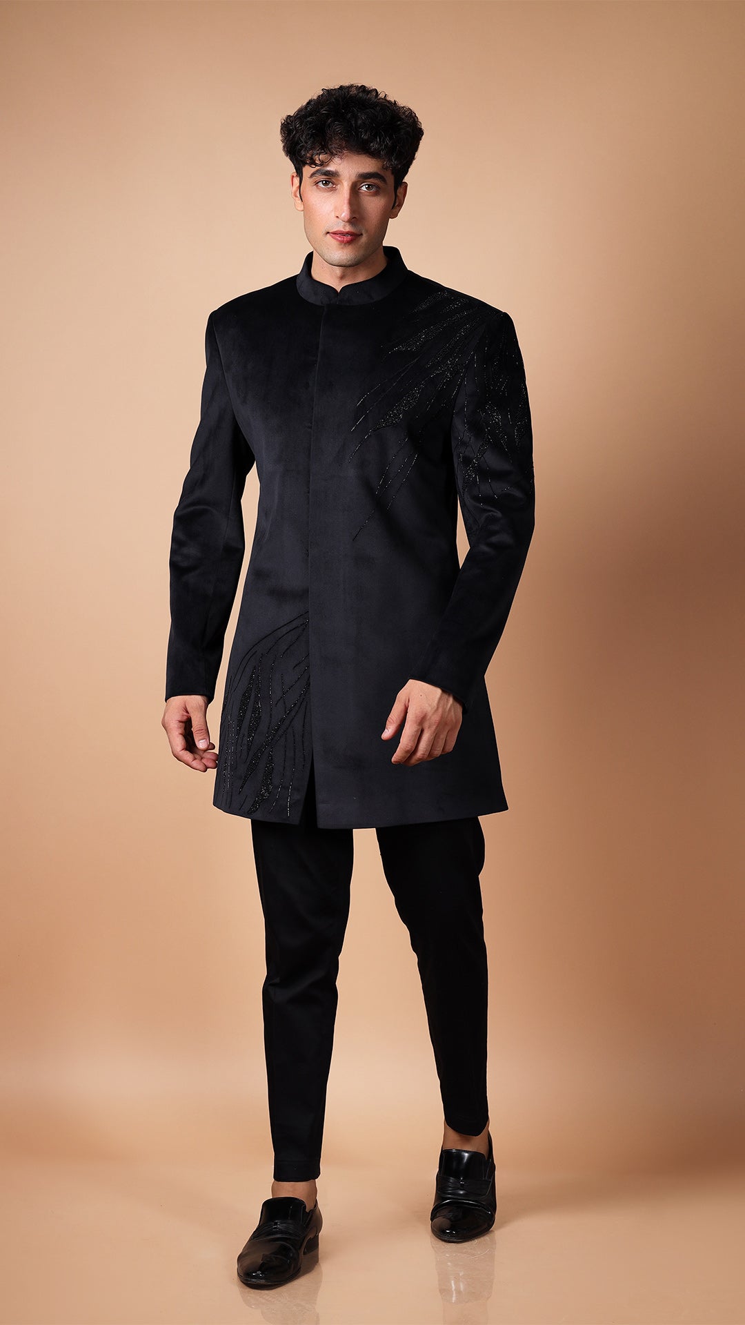 Black Suede IndoWestern with Hand Embroidery on Shoulder and Bottom Left