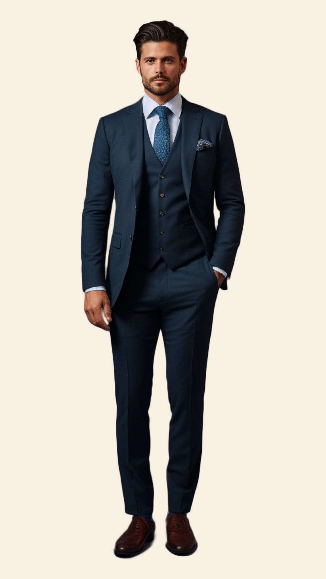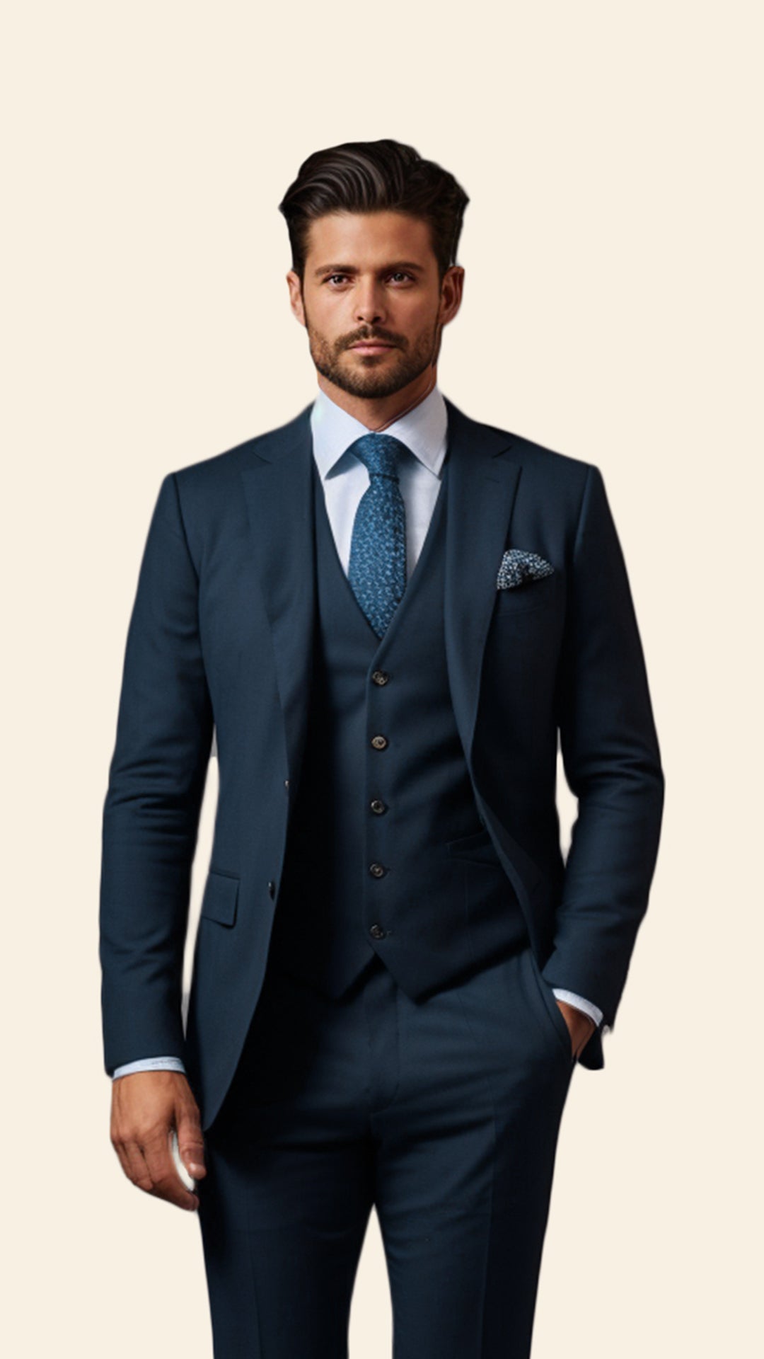 Custom Men's Three-Piece Blue Suit in Navy Shade - Crafted in Terry Rayon by BWO