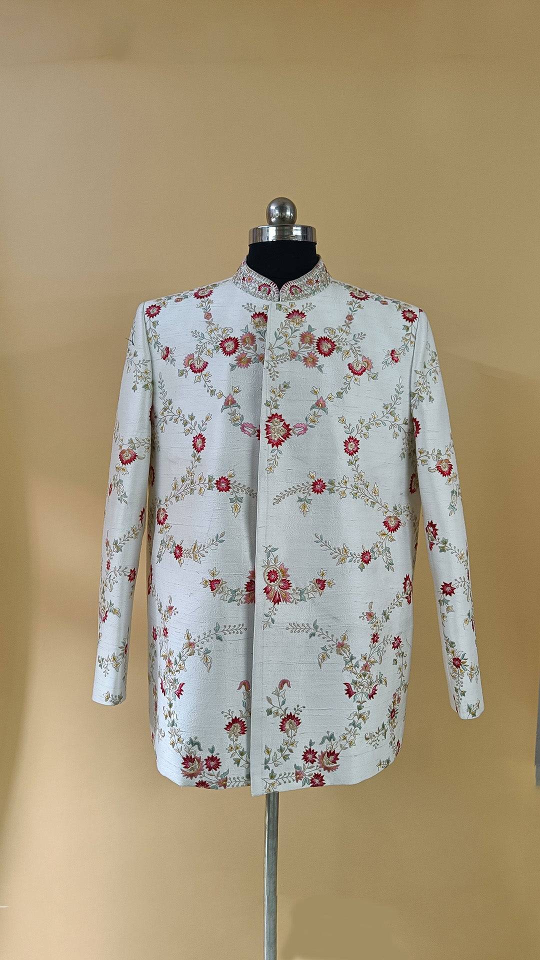 Hand Embroidered White Raw Silk Floral Jodhpuri Suit - BWO by Smit Pithadia