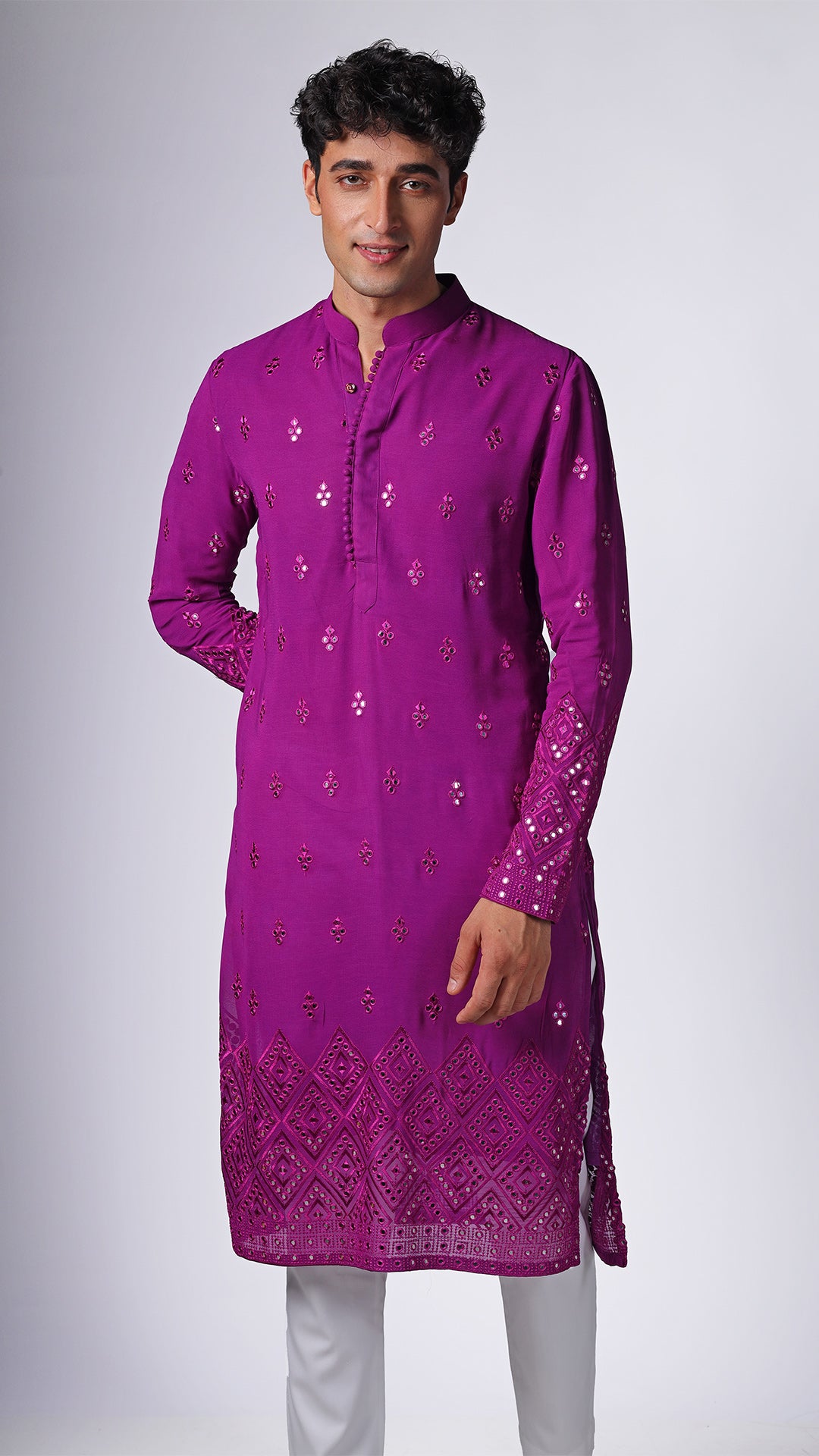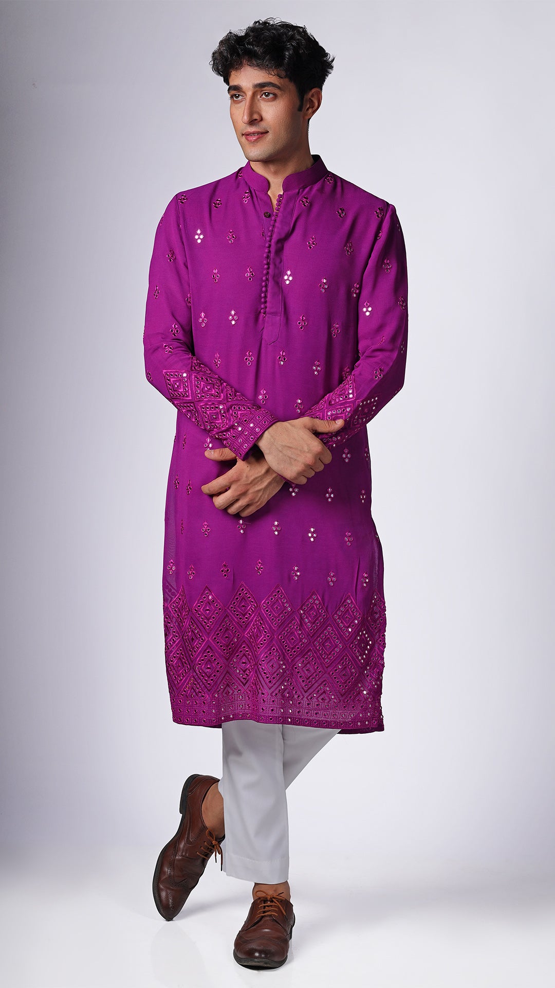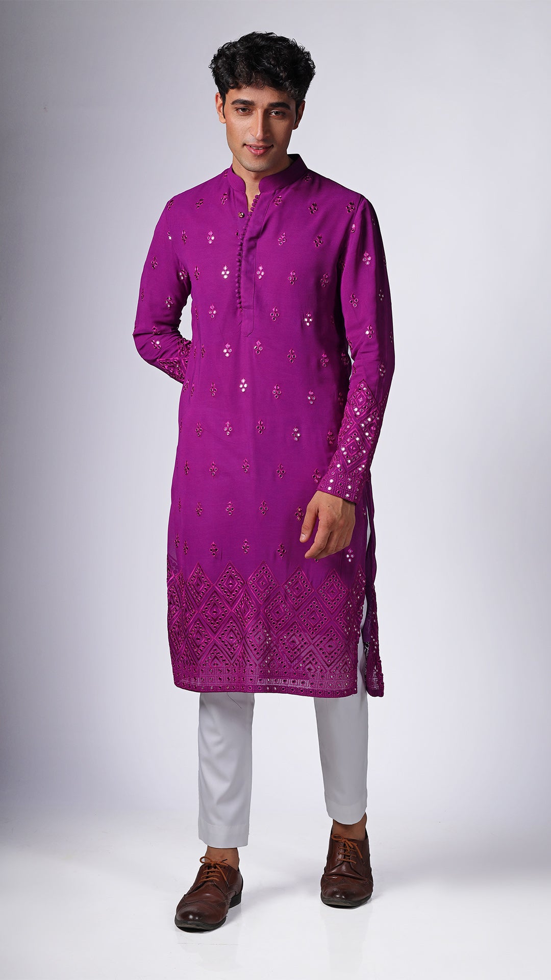 Indulge in luxury with the Magenta Kurta featuring intricate floral mirror embroidery. This kurta is tailored from premium georgette and includes an elegant concealed potli button neck, making it perfect for weddings and celebrations. Stand out with this stunning kurta and make every occasion special.