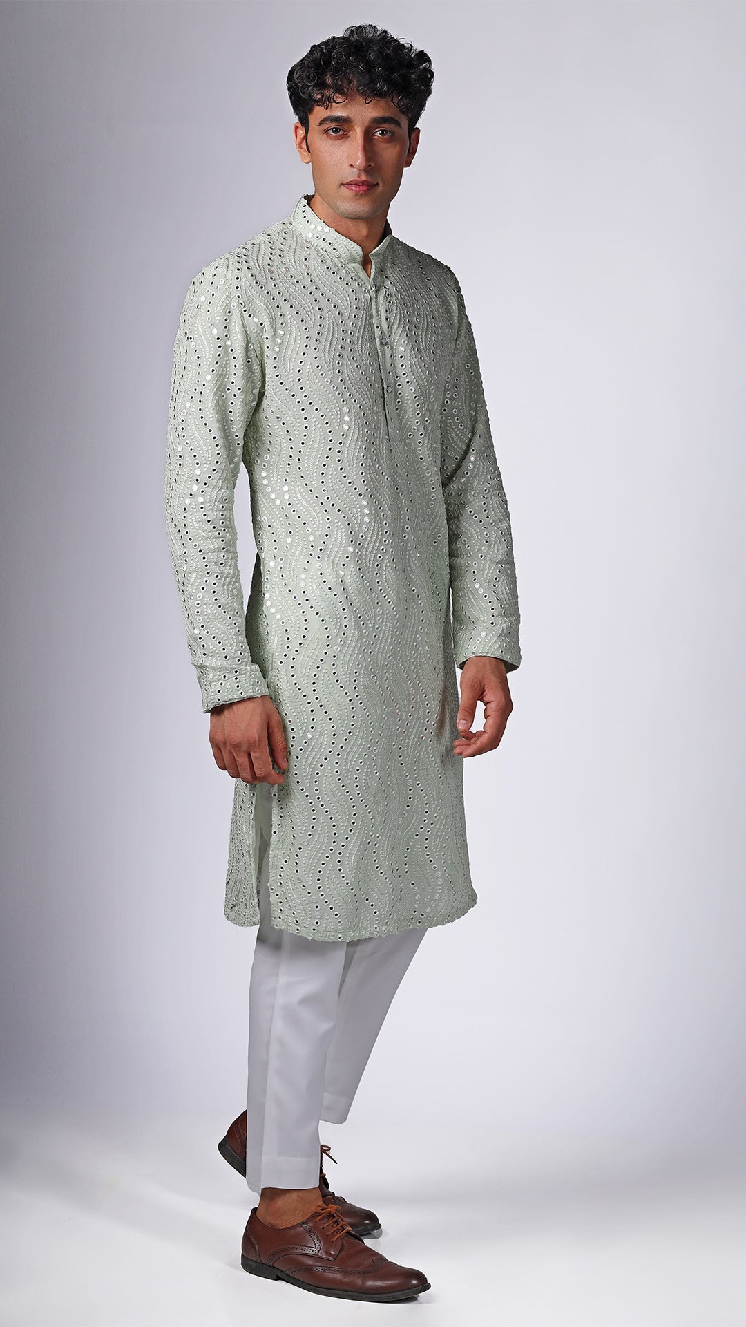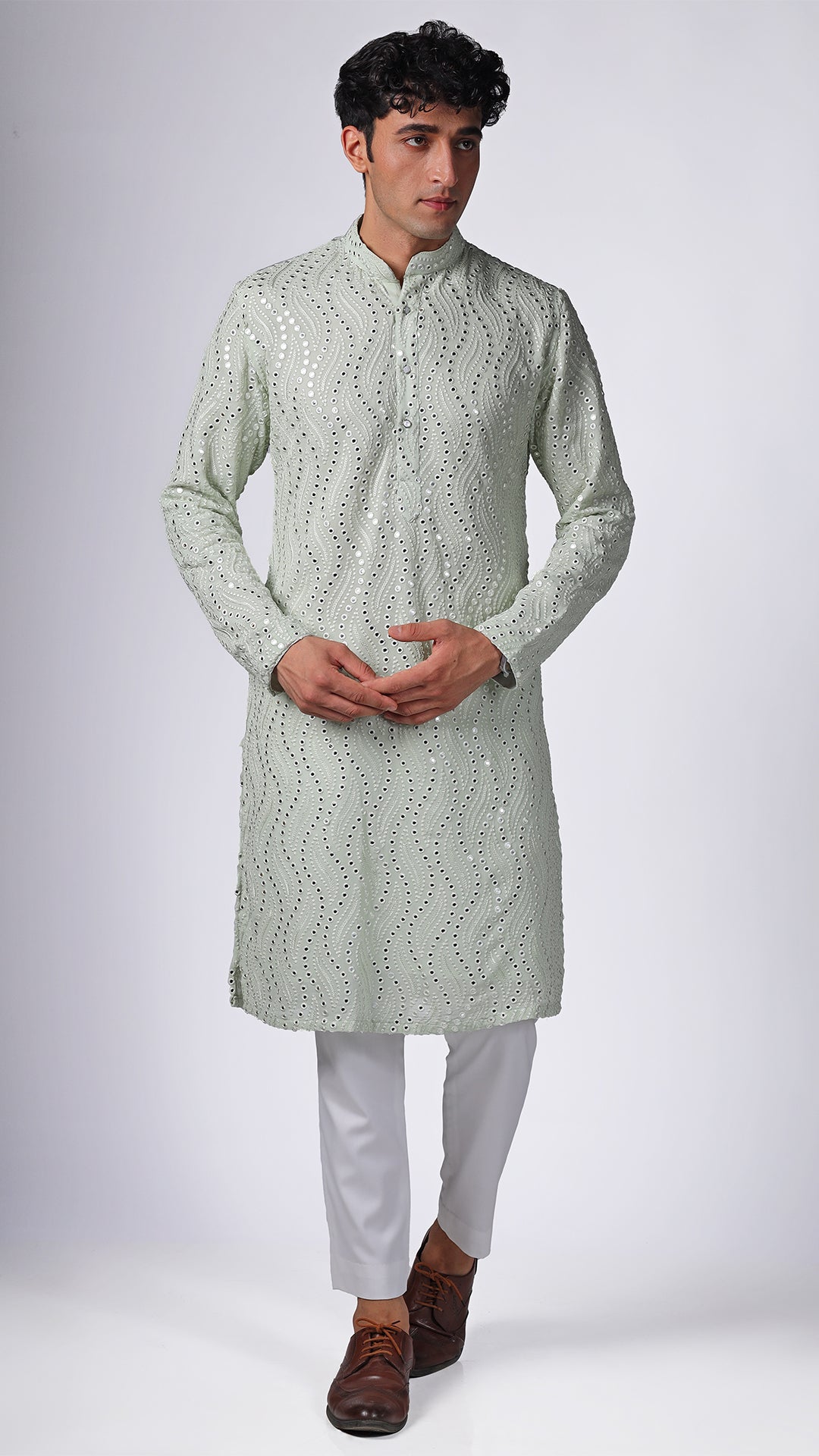 Embrace elegance with the Mint Green Kurta, featuring unique curved mirror designs. Made from high-quality georgette, this kurta includes a refined regular neck that adds to its sophisticated appeal. Ideal for festive events and special occasions, this kurta is a perfect blend of tradition and style.