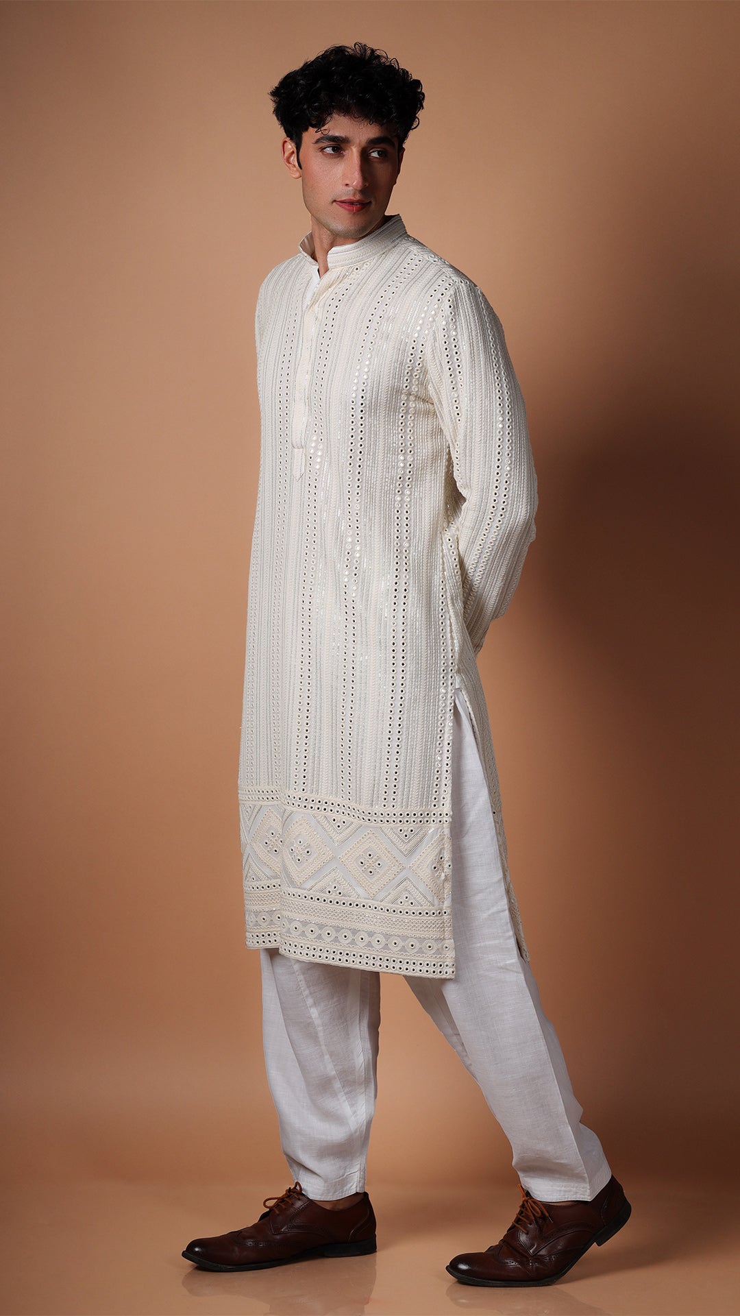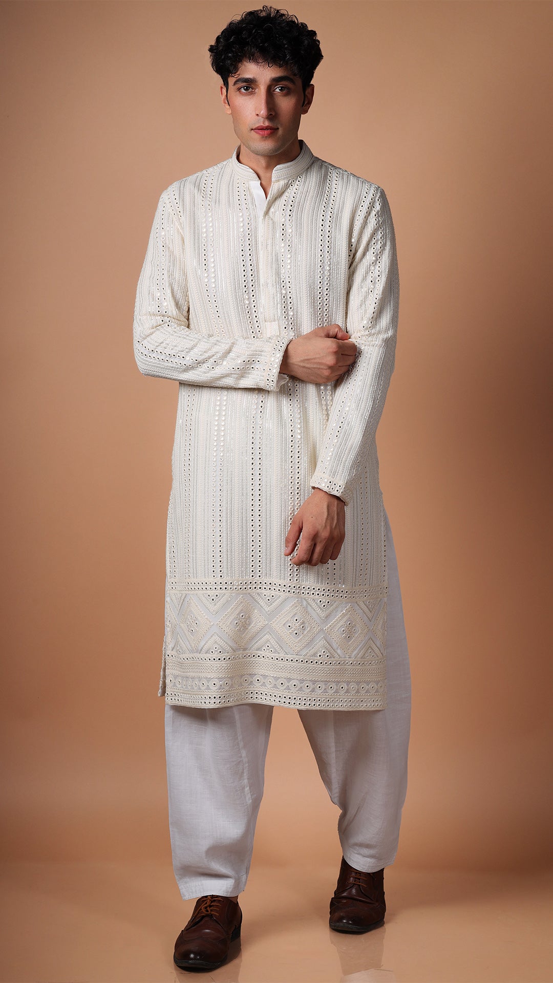 Achieve timeless elegance with the Off White Kurta adorned with vertical panel mirror work. Crafted from high-quality georgette, this kurta features a sophisticated concealed button neck that enhances its classic design. Perfect for weddings, festivals, and formal occasions, this kurta is a true embodiment of style.