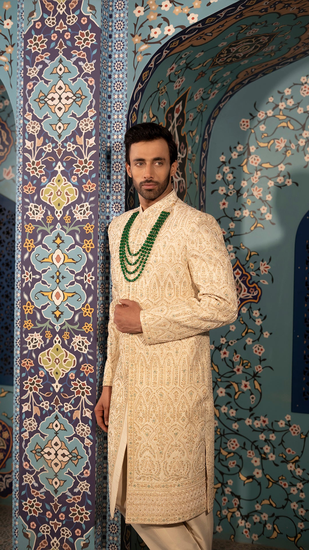 The Royal Beige Sherwani is a masterclass in understated opulence. Hand-embroidered with meticulous detailing, it features tonal hanwork and zardozi-inspired textures for a timeless wedding silhouette. Perfect for grooms and modern traditionalists alike.