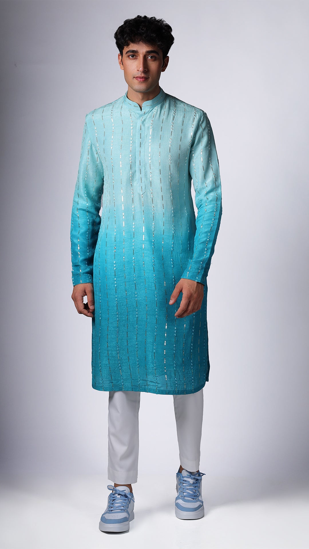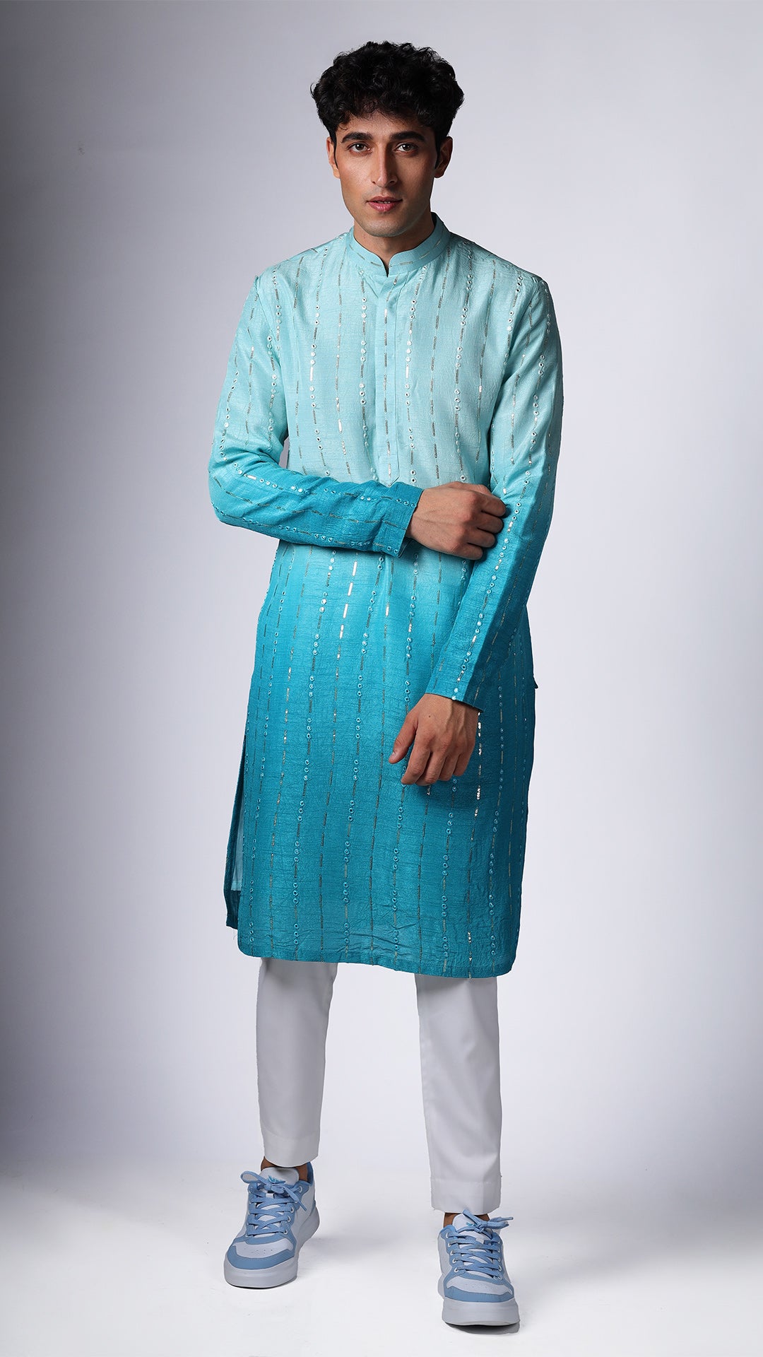 Step into elegance with the Sky Blue Ombre Kurta adorned with vertical sequin and artificial mirror embellishments. Made from high-quality dola silk, this kurta features a sophisticated concealed button neck that enhances its overall allure. Perfect for weddings and celebrations, this kurta is designed to impress.